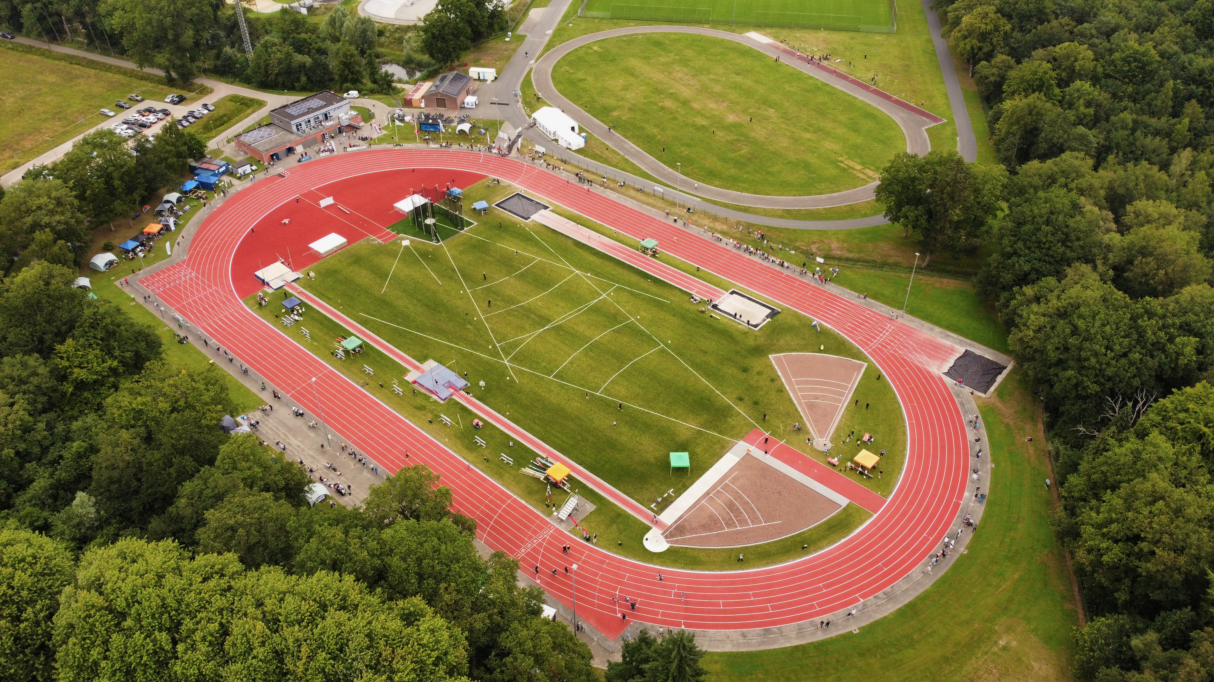 Rondom de baan staan acht palen voor de verlichting. Op paal 2 en 8 (vooraan aan de zijkant) is een extra LED-armatuur geplaatst om meer licht te geven op het middenveld ten behoeve van de werpkooi, hoogspringen en speerwerpen.