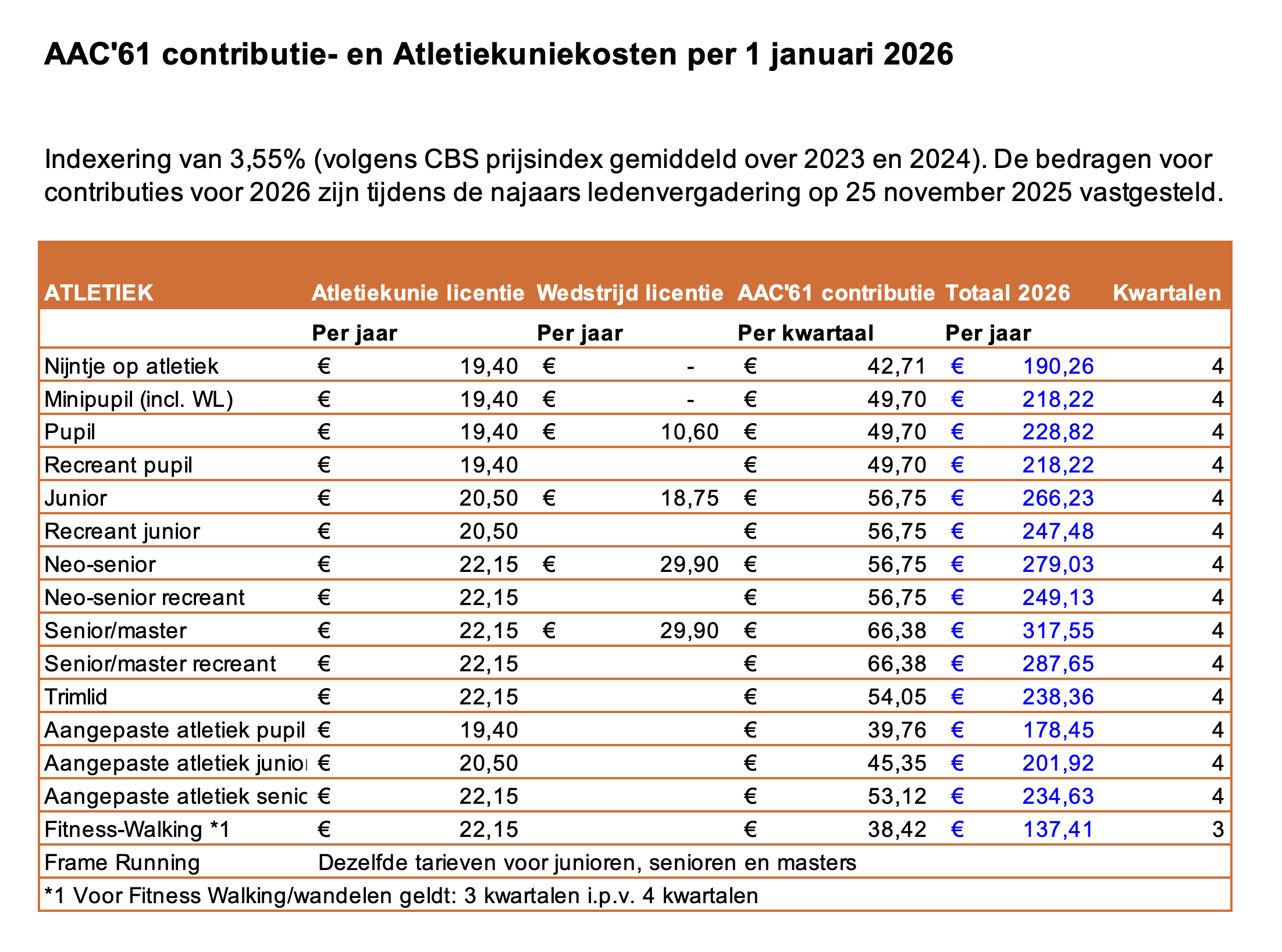 De AAC'61-verenigingscontributies worden tijdens de najaars ALV voorgesteld door het bestuur. De licentiekosten worden door de Atletiekunie bepaald.