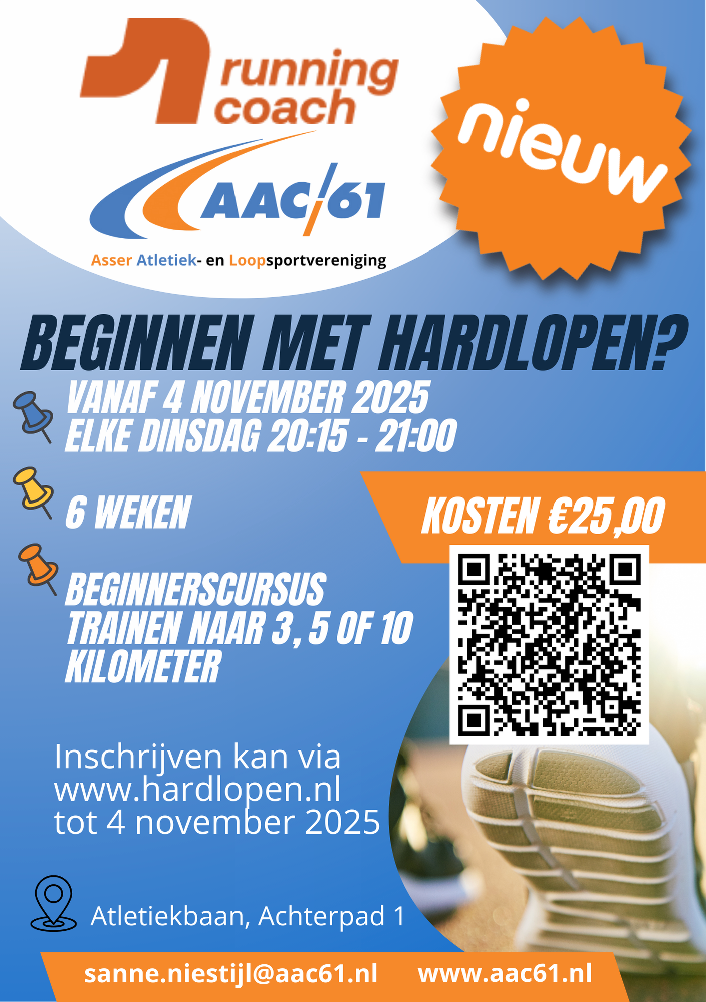 Wil jij 15 minuten kunnen hardlopen zonder te stoppen? Of gewoon plezier vinden in het hardlopen? Of misschien wel je 5km verder uitbouwen naar 10km? Het maakt niet uit wat je doel is. Wij helpen je met Running coach verder. Onze beginnerscursus, powered by Running Coach, maakt van jou in een paar weken een (betere) hardloper. Door de persoonlijke begeleiding van een professionele trainster begin je op een verantwoorde manier met hardlopen. De cursus duurt zes weken, om de zes weken is er een nieuw instapmoment om met de cursus te beginnen. Je kan maximaal 3x deelnemen aan een Running Coach cursus, daarna hopen we dat je lid wordt van AAC'61 of stop je met trainen bij AAC'61.